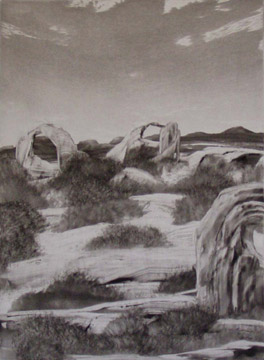 Artist's Statement on Landscapes "My landscapes are imaginary images based on actual sites. The images I portray reflect my interpretation of landscape as a moving and active force of nature through time. Elemental tensions are created and released, and the effects of this interplay are recorded on the surface of the earth. The landscape I chose to depict is the common ground we walk on, the woods or rock formations we walk through, unnoticed until we draw our attention to it. When visually walking through this paper terrain, viewers may be moved by these commonplace views, and may find that they can hold as much sublime beauty as any postcard vista." --Robert Pelegrin, 2007 |